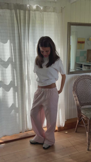 The most beautiful summer pants. The waistband is elastic & a cool front label, Really comfortable & easy fit..