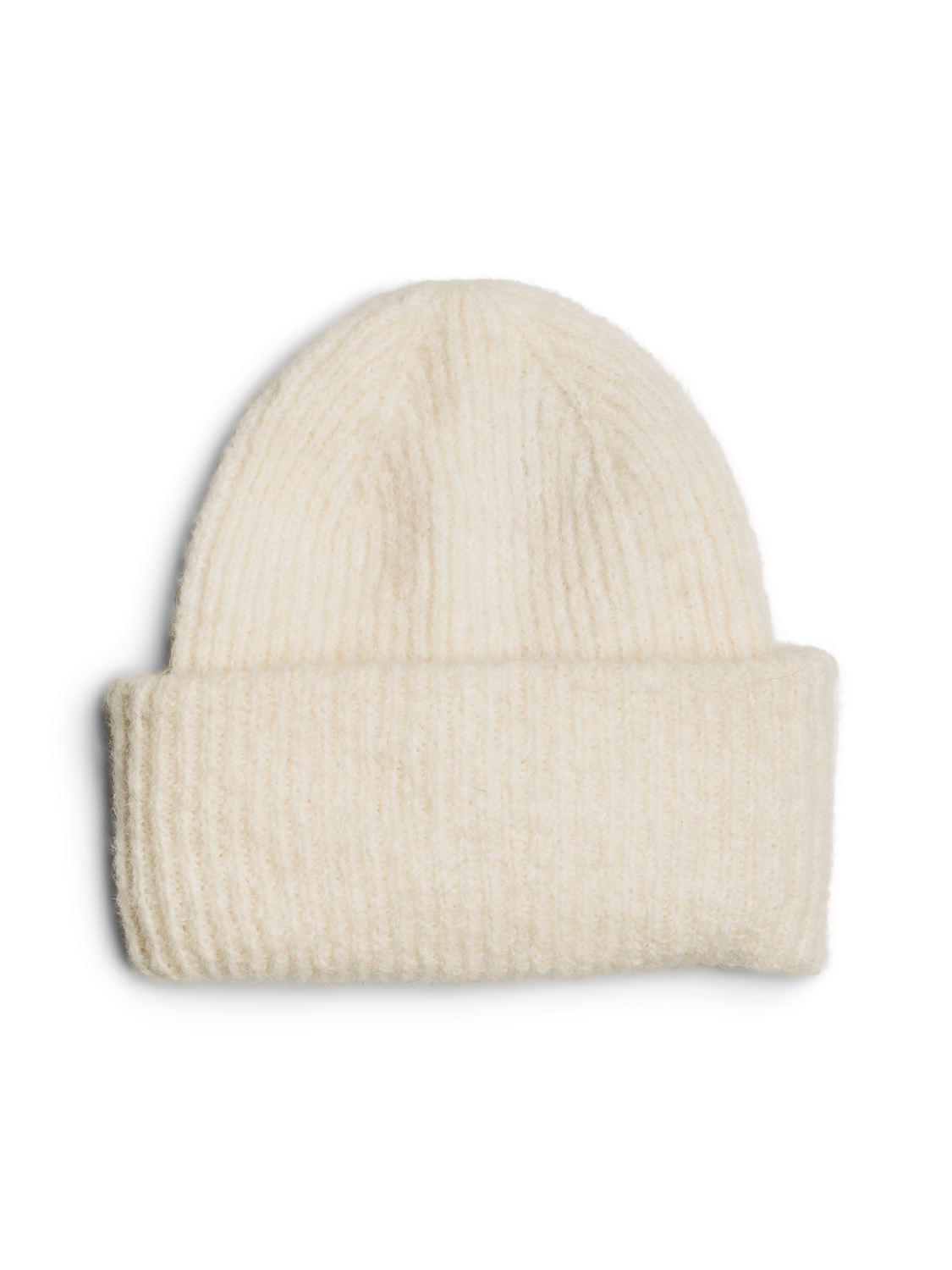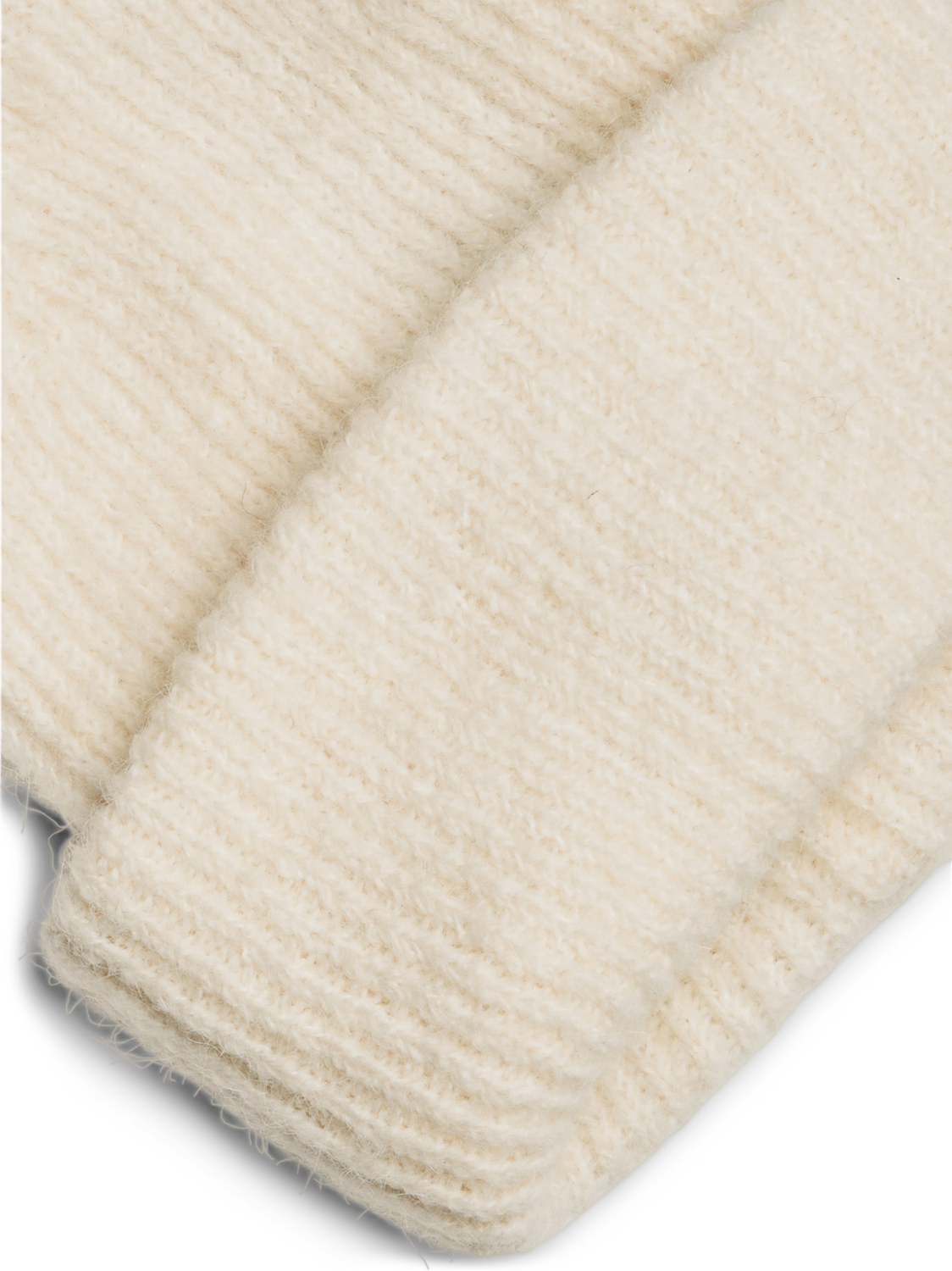 This alpaca blend hat in a light "Cloud dancer" color is perfect for keeping you warm during the fall and winter months. The hat is knitted with a ribbed structure, which gives a classic and robust look, while the materials ensure a soft and insulating feel. It combines the softness of alpaca with the strength of nylon and acrylic, making it both comfortable and durable.