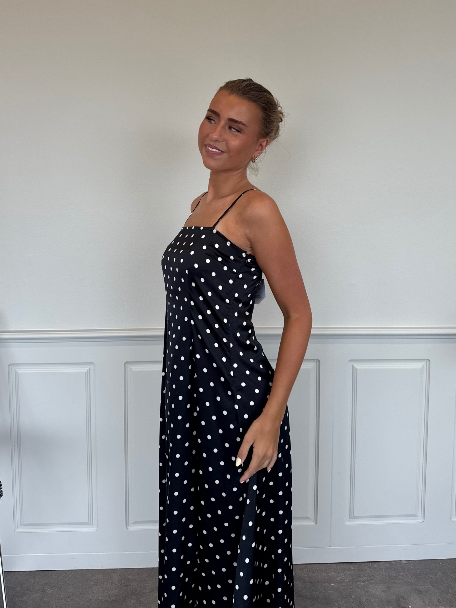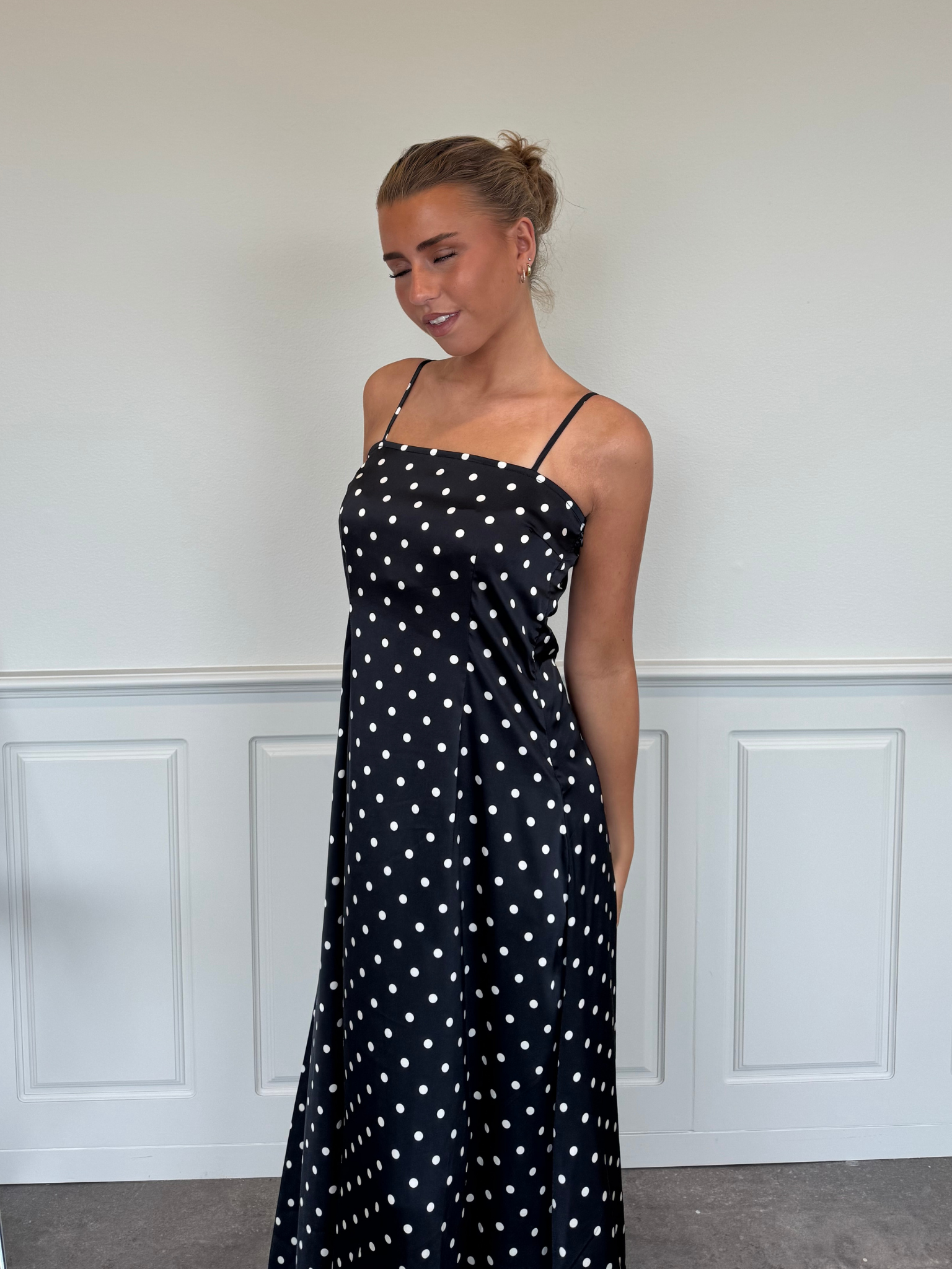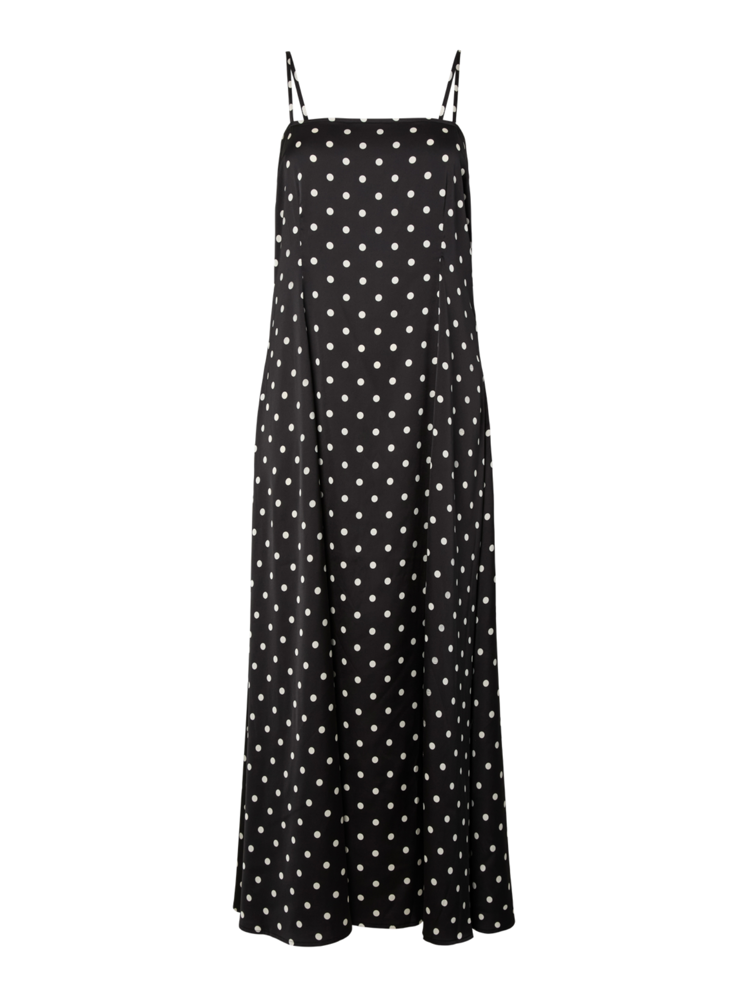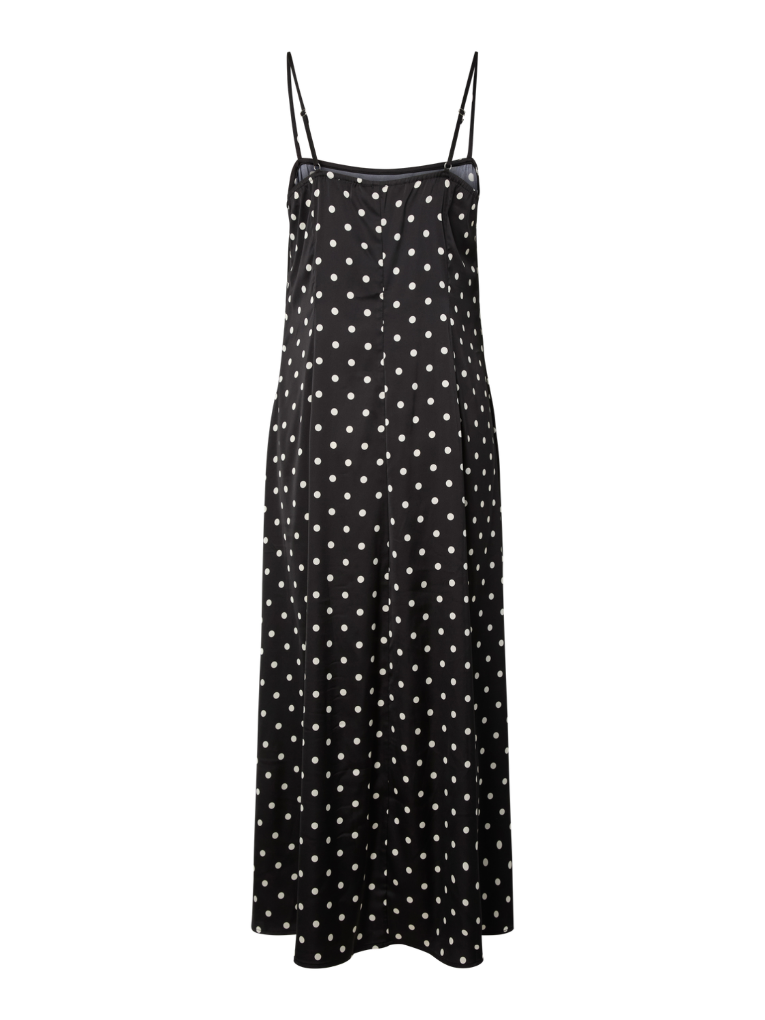 Denne ankellange satin kjole har et tidløst og feminint design med et firkantet udskæring og uden ærmer, som giver en let og elegant pasform. Kjolen er lavet af blødt polyester, der sikrer en behagelig følelse mod huden og et flot fald. Det sorte stof med hvide prikker tilføjer et klassisk touch og gør kjolen velegnet til både hverdag og særlige lejligheder.