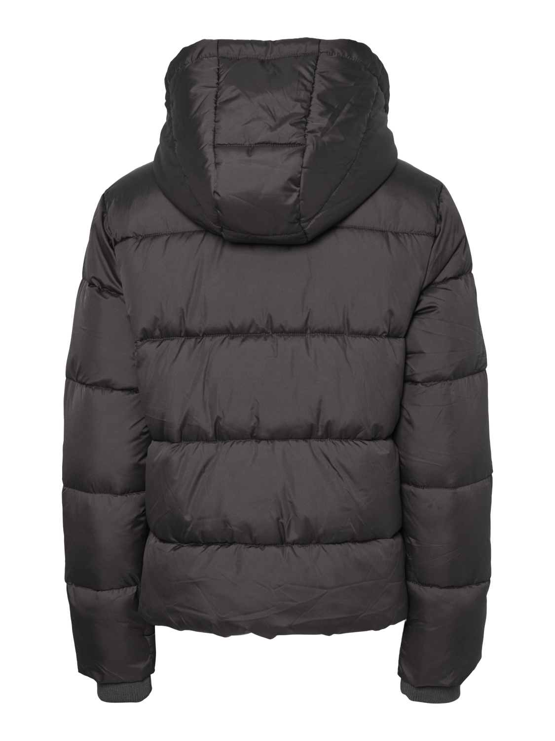 En kort pufferjakke i en mørkegrå nuance med hætte og sidelommer, der giver både varme og funktionalitet. Jakken har lange ærmer med ribkanter og lynlåslukning foran, hvilket sikrer en god pasform og komfort. Materialevalget af genanvendt polyester bidrager til en mere bæredygtig beklædning, der samtidig holder dig varm i de kølige efterårsdage.