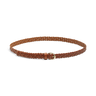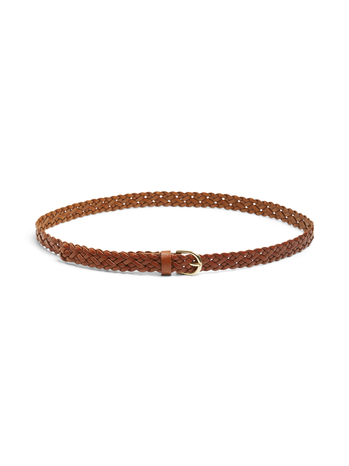 Et smalt flettet bælte i cognacfarvet kalveskind, som tilføjer et naturligt og elegant touch til ethvert outfit. Den flettede detalje giver bæltestrukturen liv og tekstur, mens spænde lukningen sikrer en praktisk og stilfuld pasform.