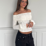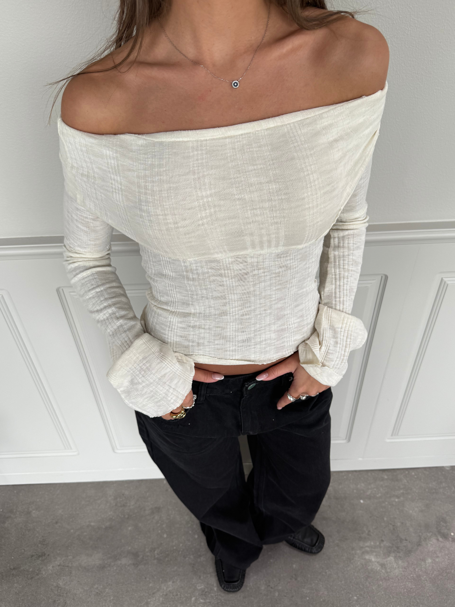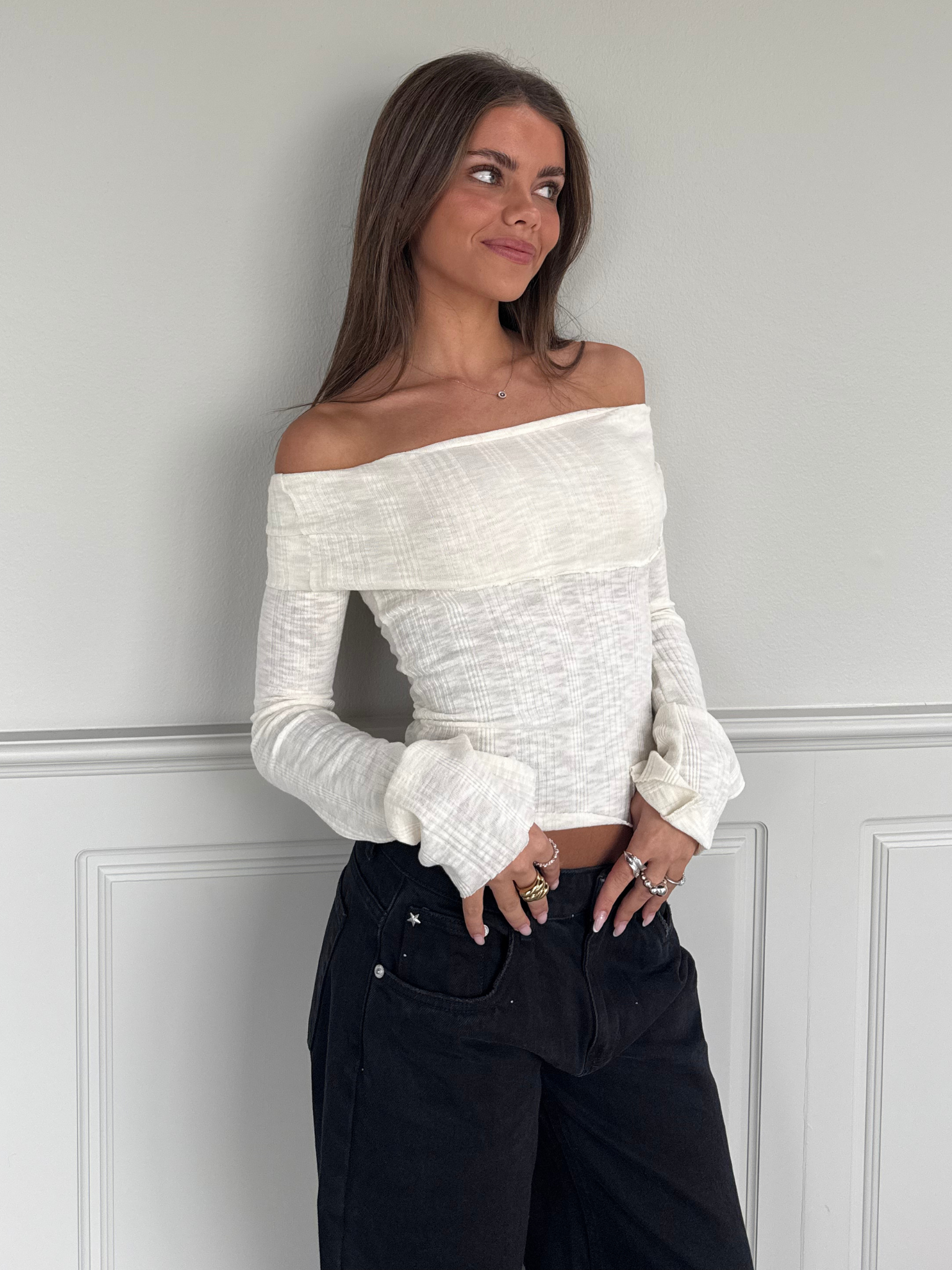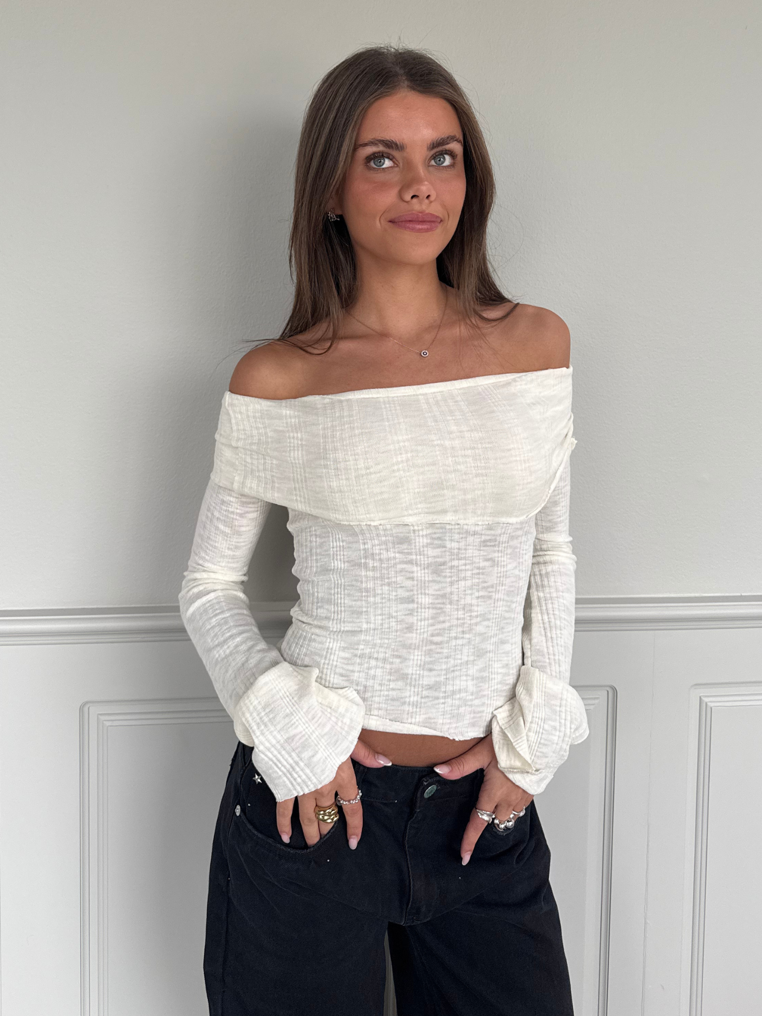 Smuk off-the-shoulder top med tætsiddende pasform I en lækker blød kvalitet.. Ærmerne er med romantisk vidde forneden & rækker godt ned over håndfladen