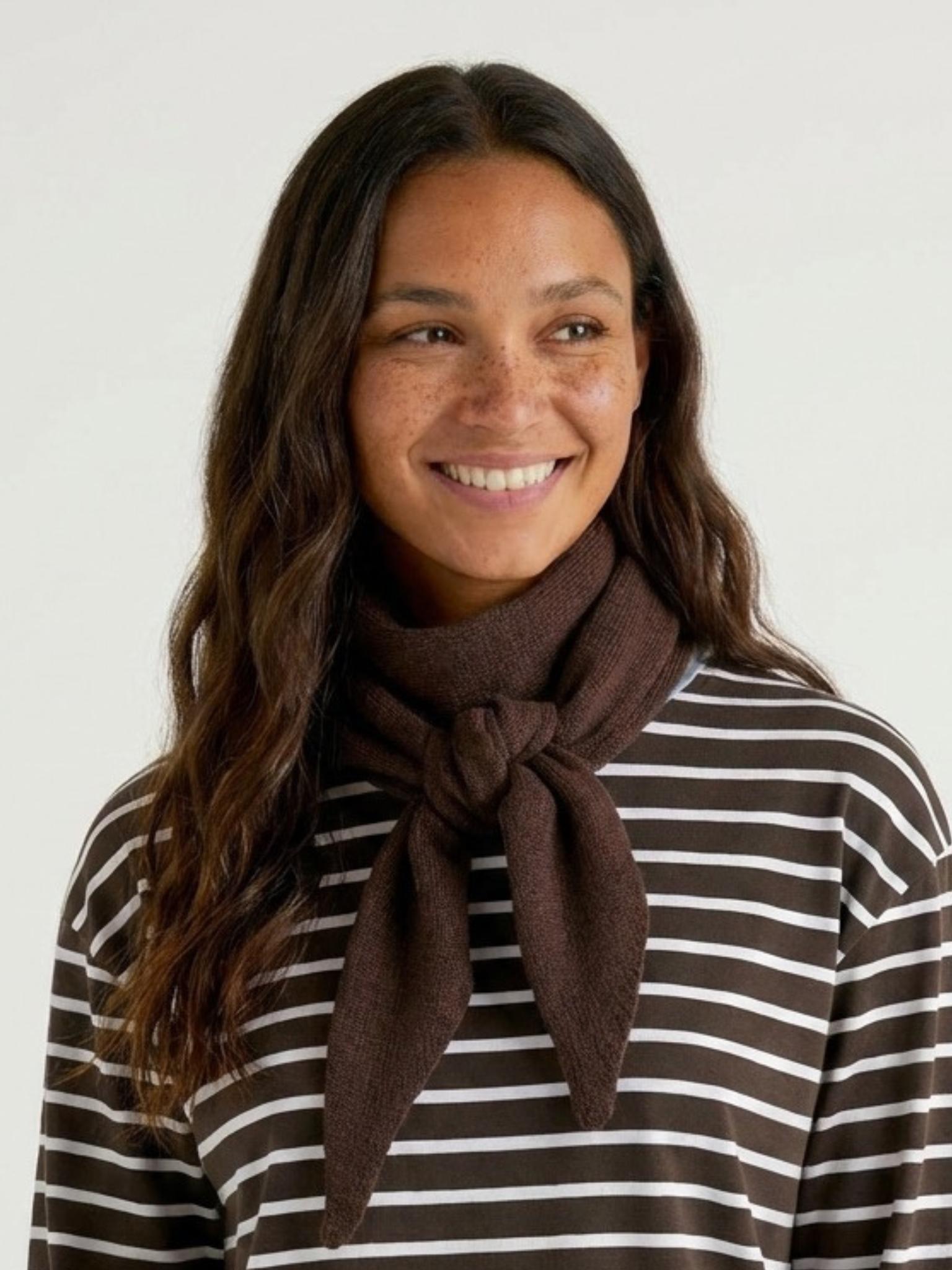 This triangle scarf in a warm, dark brown shade is the ideal accessory for fall. The soft material combines LENZING™ ECOVERO™ viscose with polyester and nylon, giving it a light and comfortable feel with a supple fit reminiscent of silk. The scarf has a one-size fit, making it easy to style with different outfits and keep you warm on chilly days.